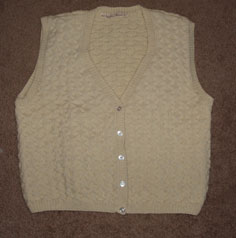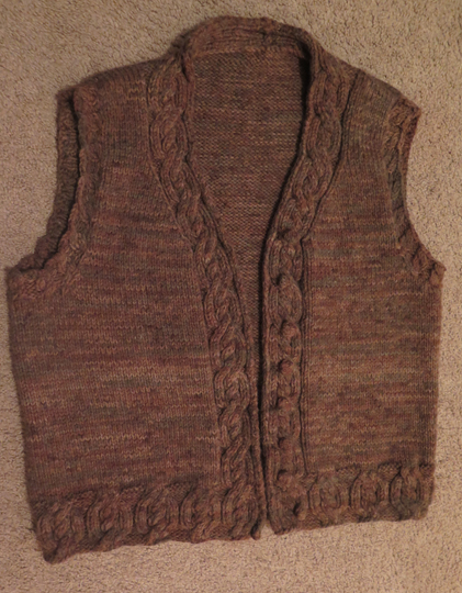 The cream colored vest was published in "Cast On" magazine