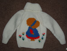 A sampling of the more than 30 different Mary Maxim children's sweater patterns that I knit for family and craft shows.